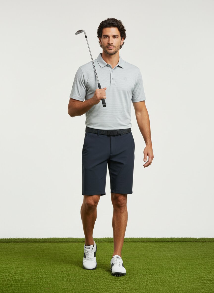 Golfhose kurz mit seitlichen Eingrifftaschen, rechts mit Tee Holder und Gesäßtaschen, Innenbund und rechte Gesäßtasche mit Antirutsch-Tapes