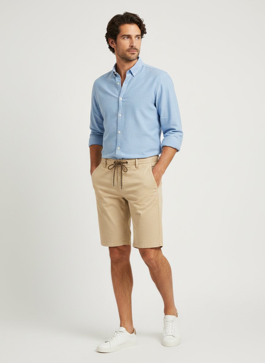 Bermudashorts in hellgreigem Baumwoll-Stretch mit Kontrastkordel