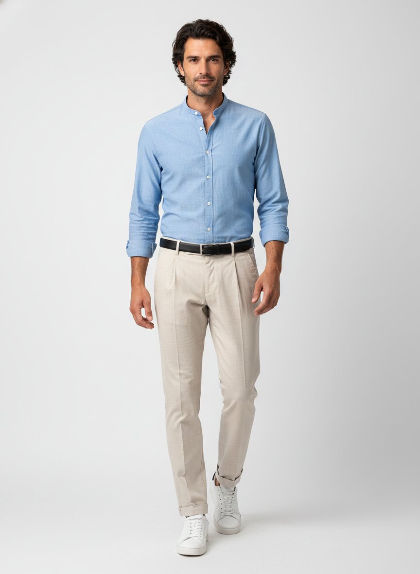 Bundfalten, elastischer Bund an der Hinterhose, seitliche Einschubtaschen, geknöpfte Gesäßtaschen, mit Saumumschlag
